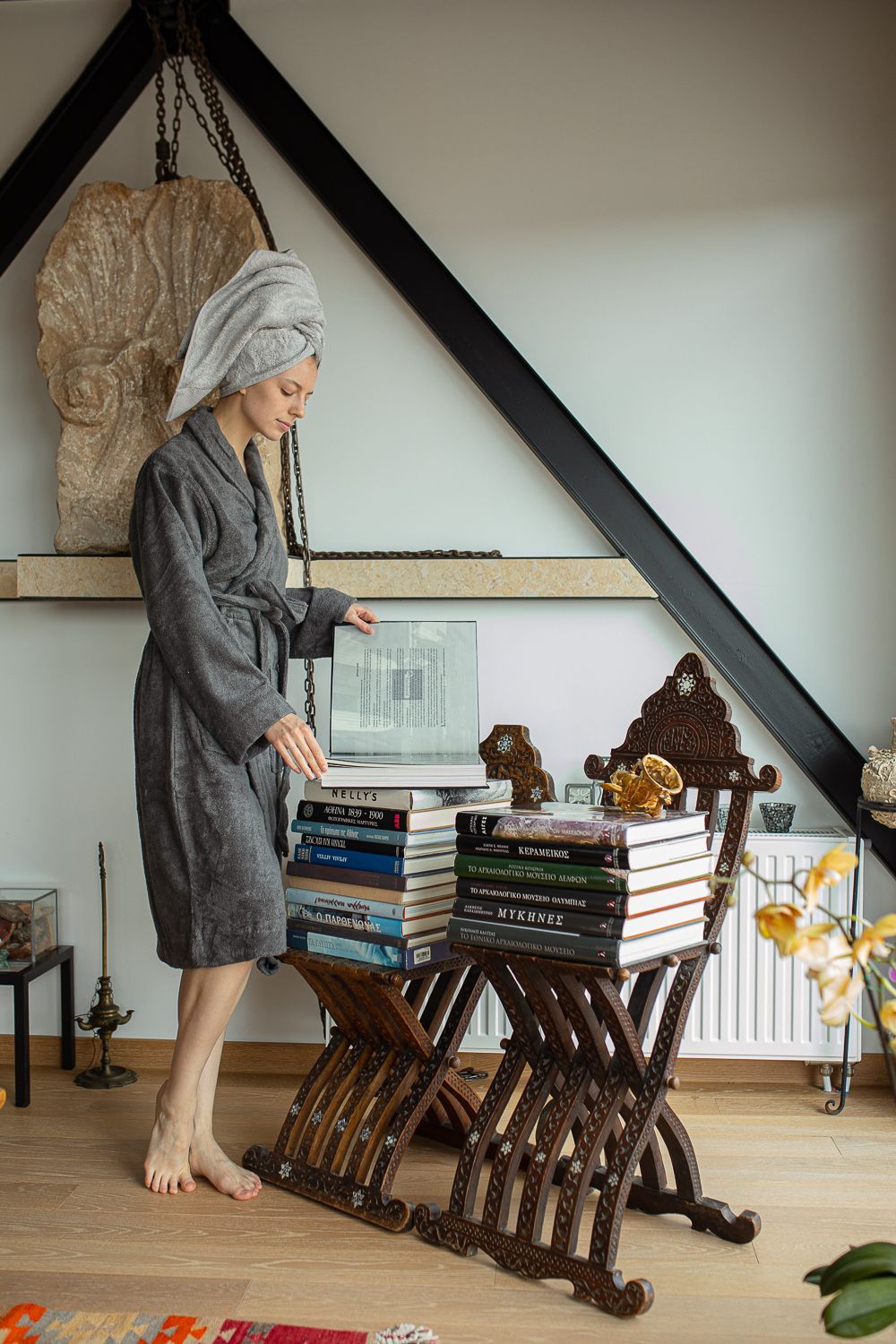 Bamboo has natural hypoallergenic properties, absorbs moisture, and regulates temperature. Cotton adds stability, durability, and absorbency to the fabric, ensuring that the bathrobe maintains its shape and functionality over time and with use. With a weight of 500 grams per square meter (GSM), this bathrobe features a dense and heavy fabric, offering a warm, spa-like feel.